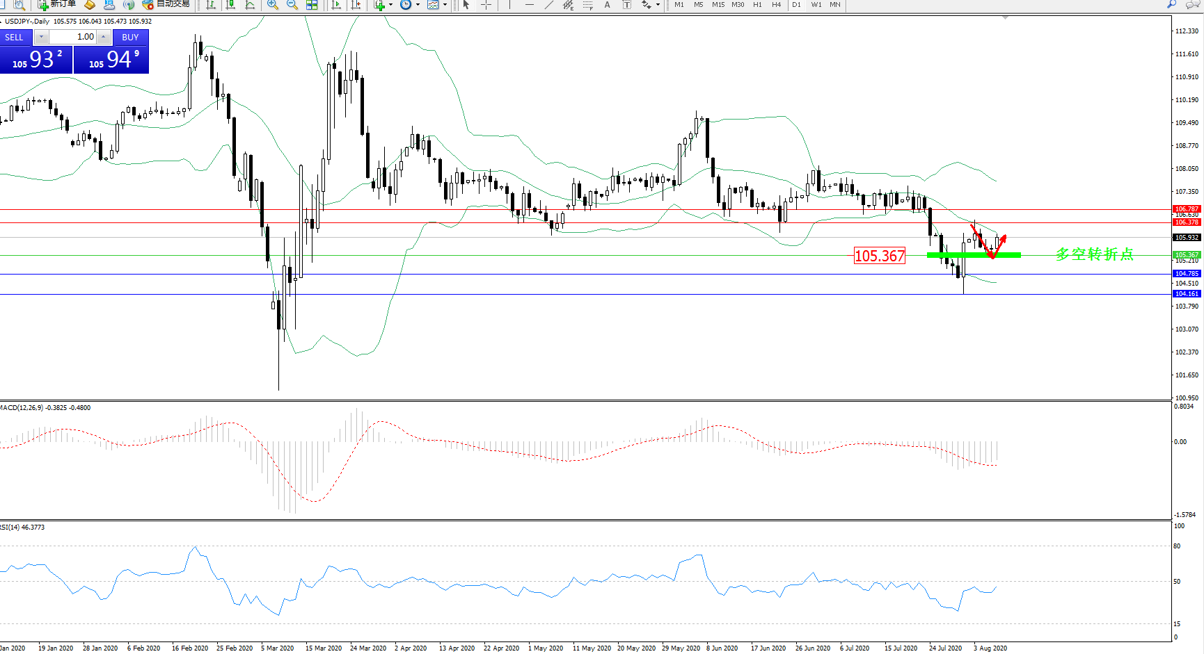 技术点评:高位空头动力延续布林带指标下轨持续弱势下行数日后,低位抵达104.161附近出现快速回升至布林带指标中轨附近整理,触及中轨后开始维持弱势震荡,处于转折点上方徘徊,布林带指标呈张口走势后以后收口迹象且下行趋势有形成态势,MACD指标处于0轴线下方空头区域弱势整理震荡下移后开始平移,RSI指标处于空头动力持续震荡下移后出现快速拉升走势;