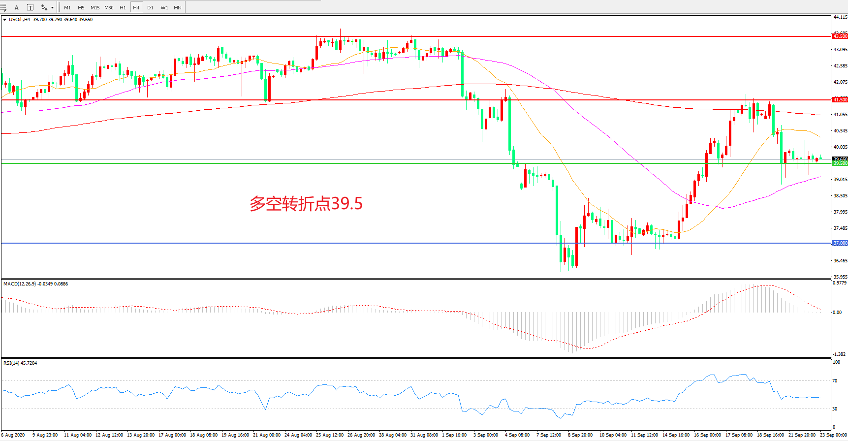 4小时图看,油价以39.5美元为依托延续震荡,整体波幅较小,均线系统走平,MACD红柱减少,RSI指标走平,日内延续震荡概率较大。