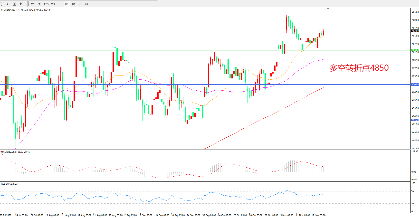 4小时图看,沪深300震荡上行,短期走势有所回暖,21周期均线成为支撑,MACD红柱缩短,RSI指标向上,日内延续震荡概率较大。