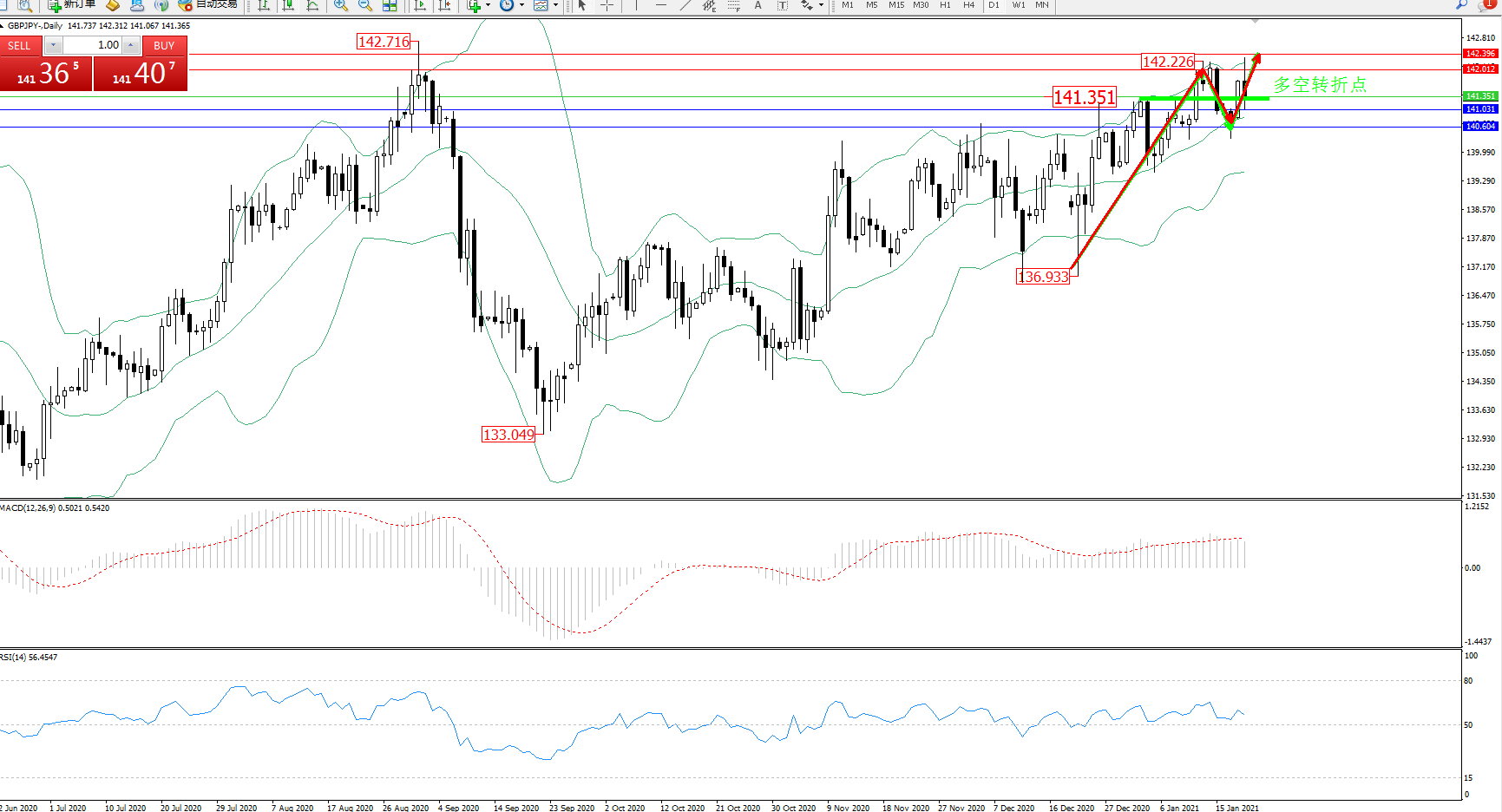 备选策略:141.351下方看跌,目标141.031、140.604