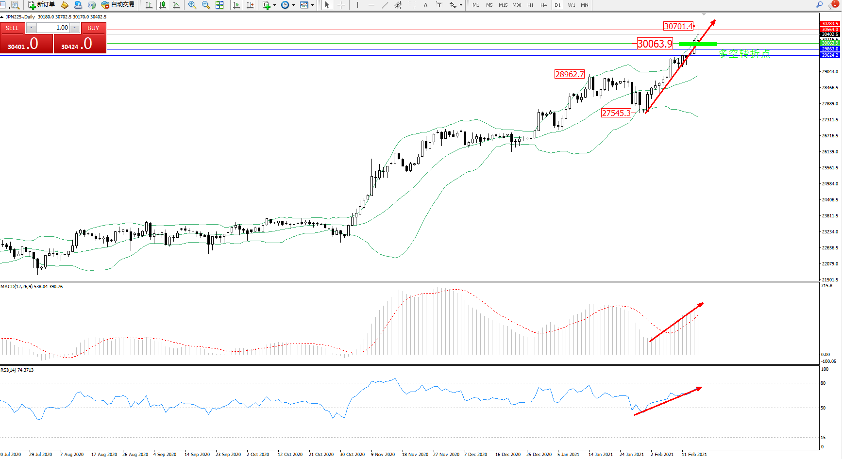 技术点评:多头动力延续布林带指标上轨附近节点持续震荡上扬态势良好,突破布林带指标上轨抵达30701附近节点后有进一步上行态势,布林带指标呈张口走势持续中,关注上轨附近关键转折点,MACD指标处于多头区域维持整理平缓上移中,RSI指标处于多头区域整理向上移动走势中;