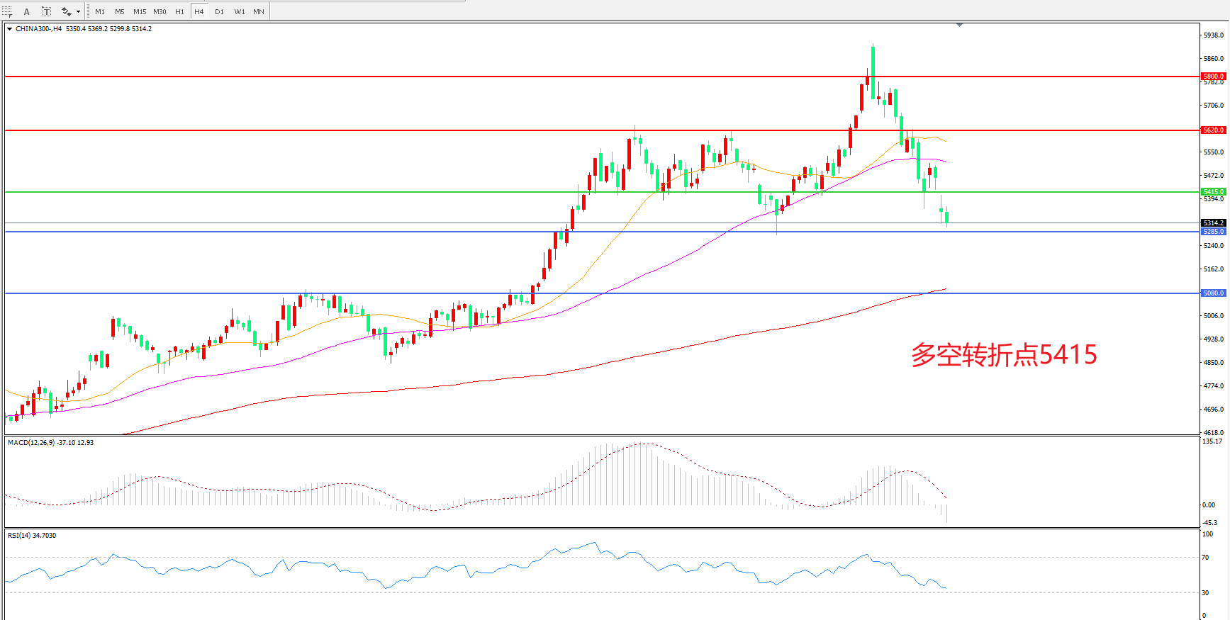 4小时图看,沪深300延续低位窄幅震荡,短期表现相对低迷 ,55周期均线成为上方阻力,5415成为短期支撑,MACD红柱缩短,RSI指标走平,日内延续震荡概率较大。