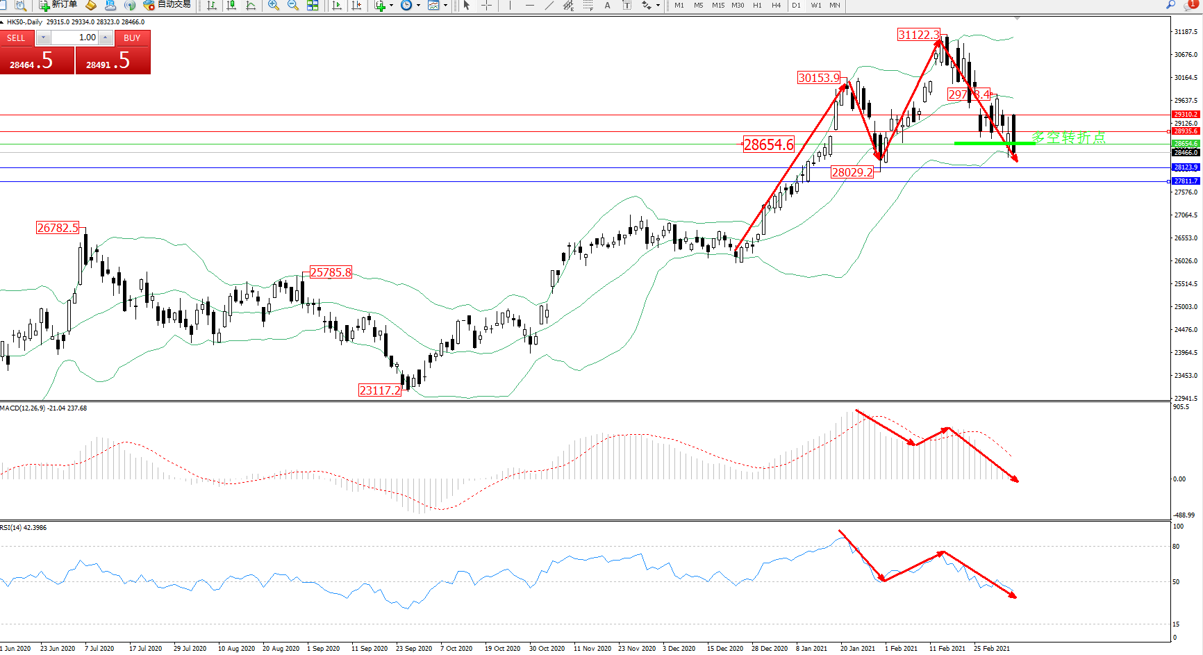 技术点评:多头动力延续布林带指标通道中上轨区间持续震荡上扬后,高位抵达31122位置后遇阻出现反转震荡下行,触及布林带指标下轨附近节点后开始宽幅震荡,空头动力有进一步向下移动态势,且跌势未见止步迹象,MACD指标处于多头区域高位维持震荡下行,触及0轴线后有进一步向下移动态势,RSI指标处于50均衡线附近弱势整理后不断下移中;