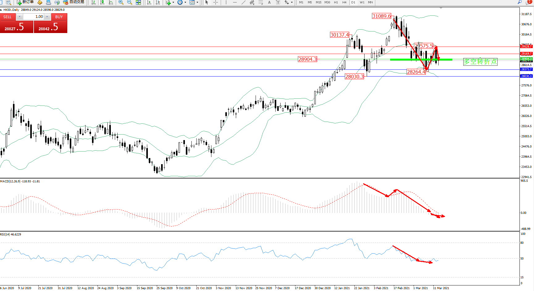 交易策略:28904下方看跌,目标28373、28030