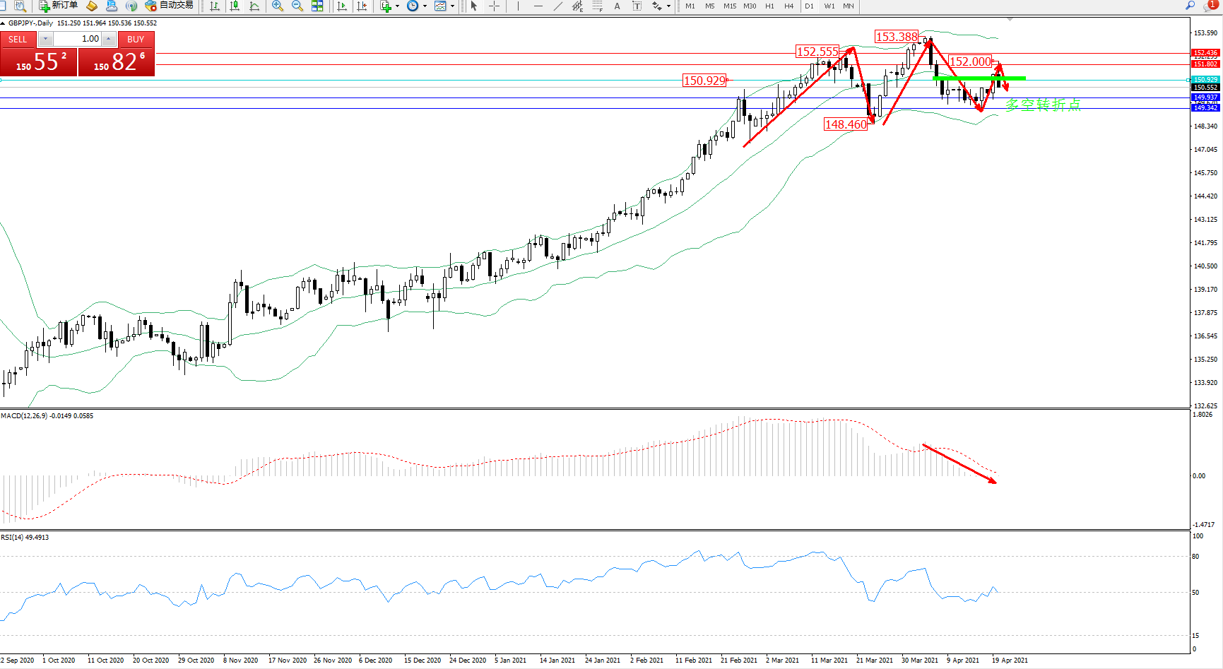 备选策略:150.929上方看涨,目标151.802、152.436