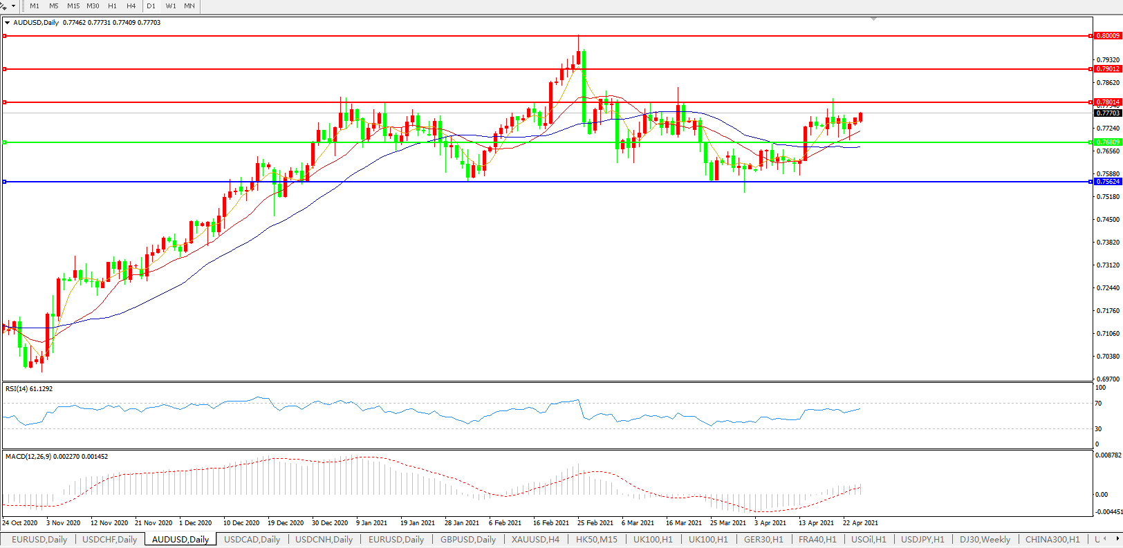 备选策略:0.7680下方看跌,目标0.7560、0.7400