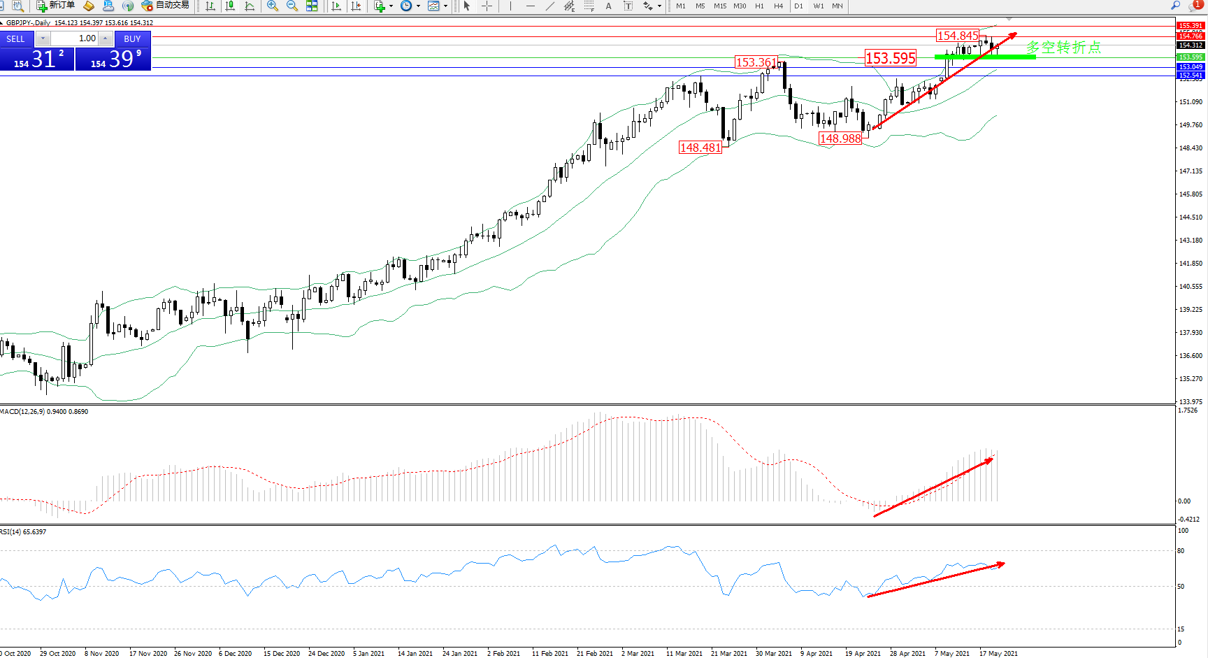 交易策略:153.595上方看涨,目标154.766、155.391