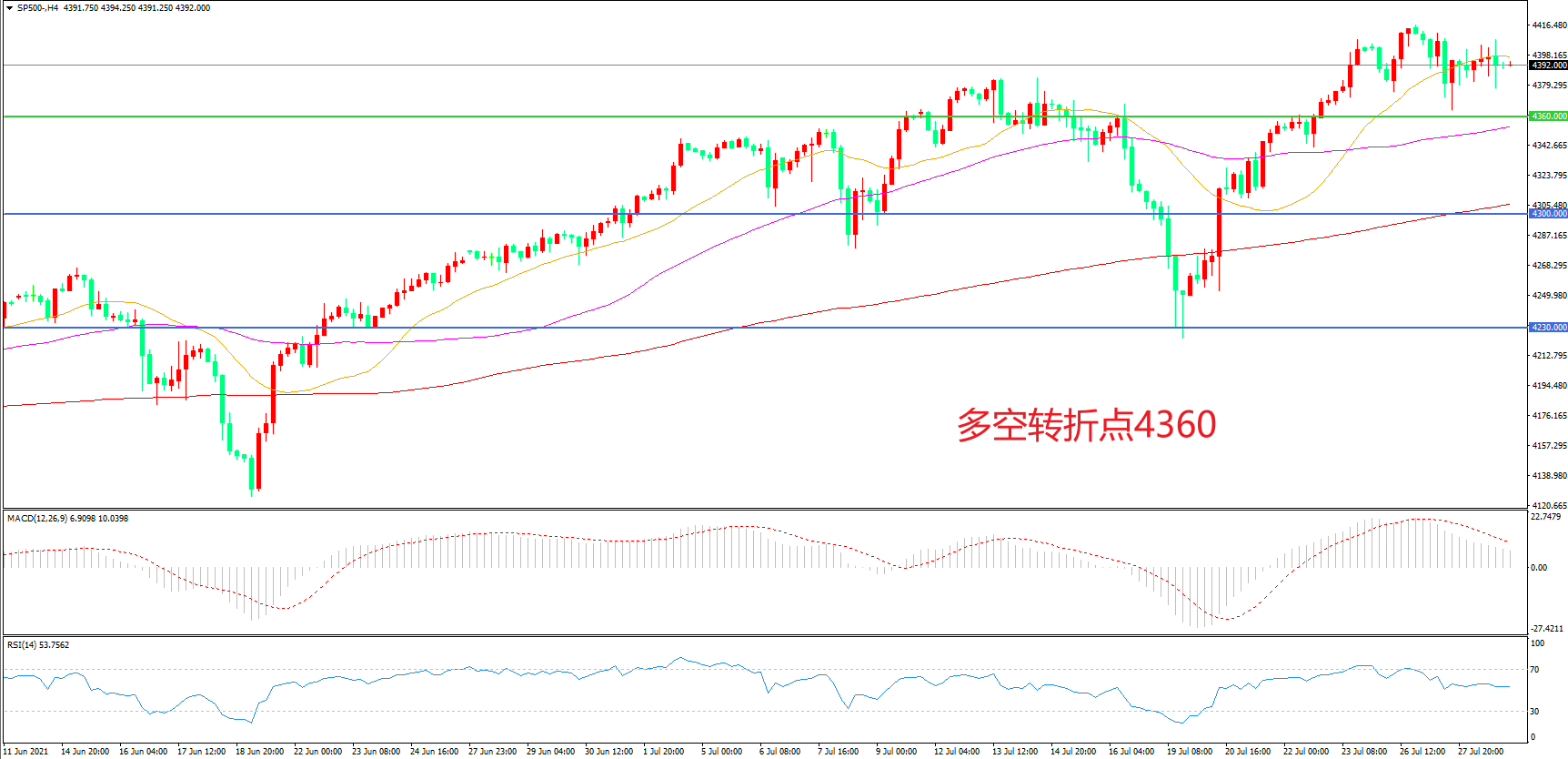 4小时图看,标普500延续高位震荡走势,上行趋势暂缓,均线系统逐渐走平, MACD红柱缩短,RSI指标走平,日内震荡上行概率较大。