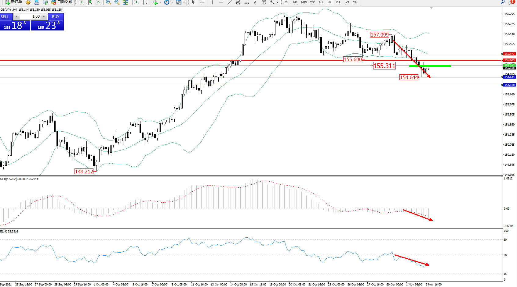 技术点评:空头动力延续布林带指标通道中下轨区间持续震荡下行,低位跌破下轨至154.644位置后得到短暂支撑,多头动力有伺机入场迹象,但高位空头下行潜力持续,短期或有继续下移迹象,布林带指标呈缓慢张口走势中,MACD指标处于空头区域维持整理缓慢下行,RSI指标处于空头区域维持整理下行中;
