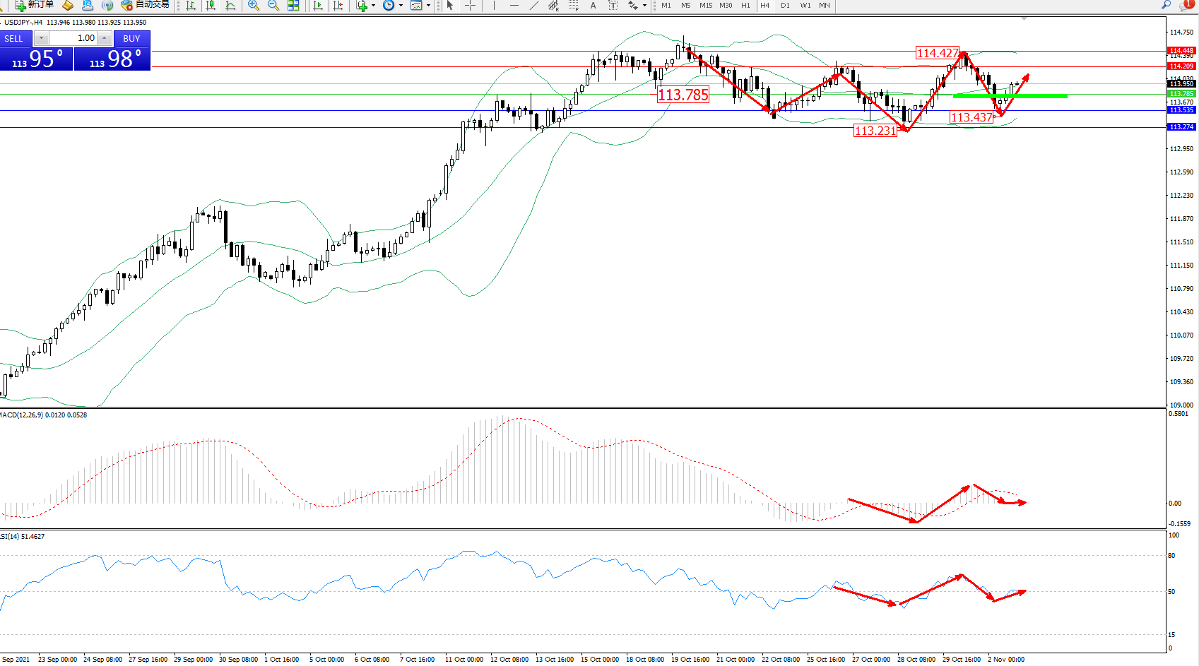 交易策略:113.785上方看涨,目标113.535、113.274