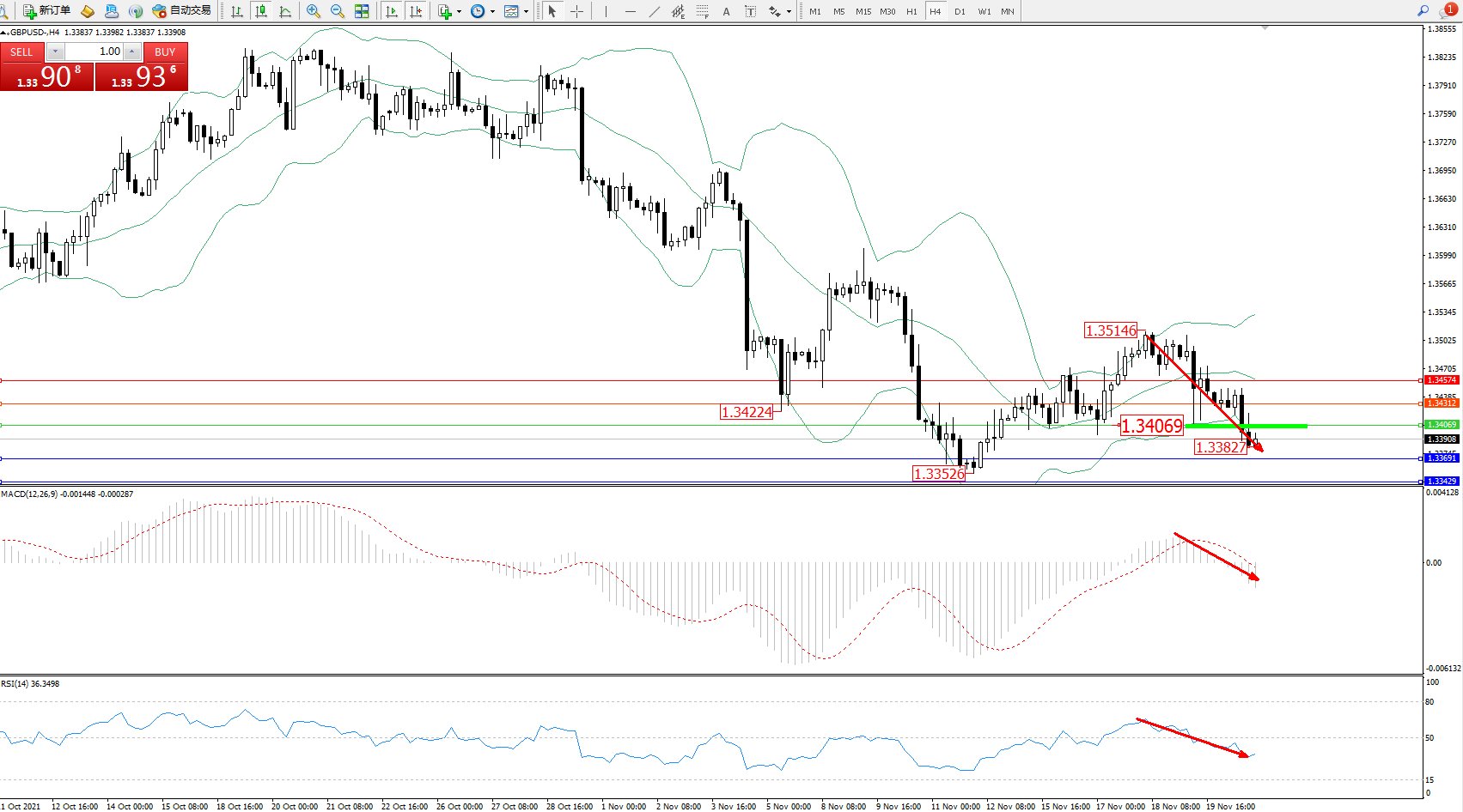 交易策略:1.34069下方看跌,目标1.33691、1.33429