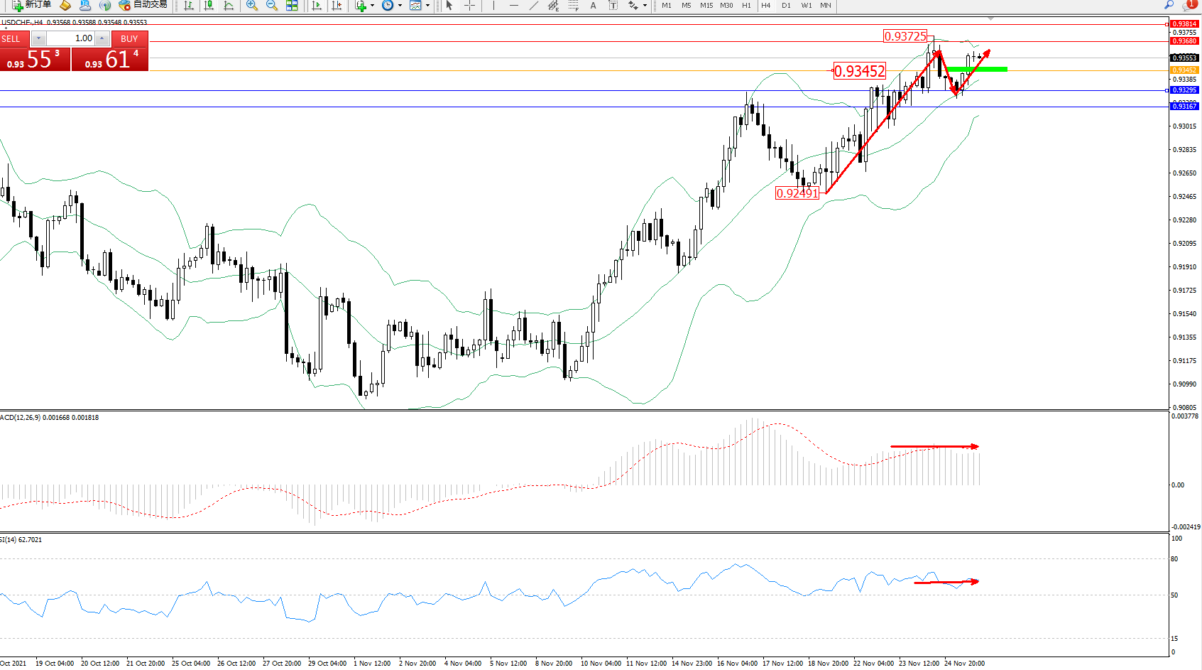 交易策略:0.93452上方看涨,目标0.93680、0.93814