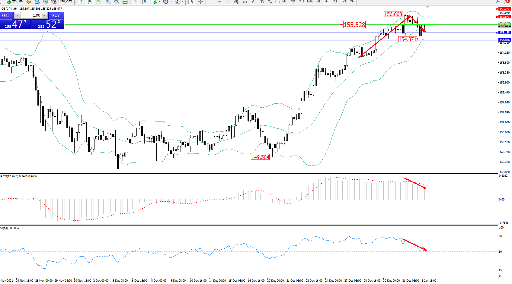 交易策略:155.528下方看跌,目标155.158、154.816