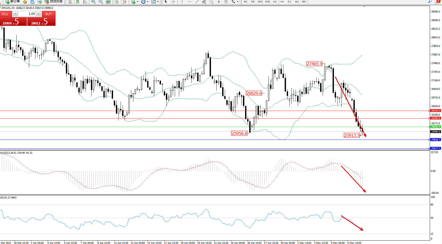技术点评:空头动力延续布林带指标通道下轨附近不断震荡下行,低位抵达25913附近节点后震荡,短期空头动力有继续向下移动态势,布林带指标呈张口走势态势良好,MACD指标处于空头区域不断震荡下行,RSI指标处于50均衡线下侧维持弱势震荡不断下移中;
