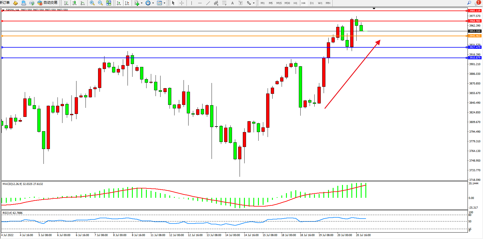 标普SP500——4小时K线图显示: