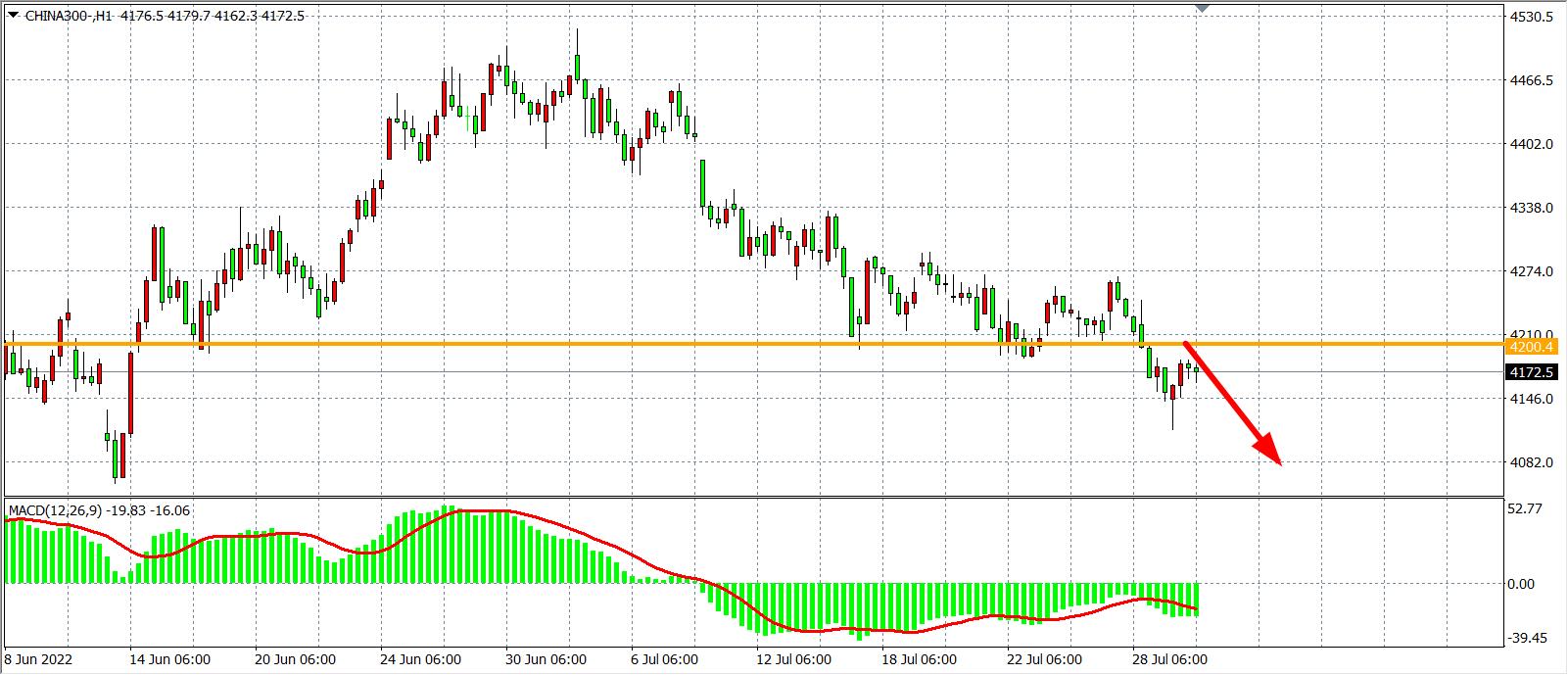 1小时图看,沪深300在跌至4115后反弹回升,但依旧未能上破4200关口,再度出现承压,趋势仍旧偏弱势,同时MACD于零轴之下量能持续放大,预示行情有进一步回探的风险,在4200阻力之下看4100-4050
