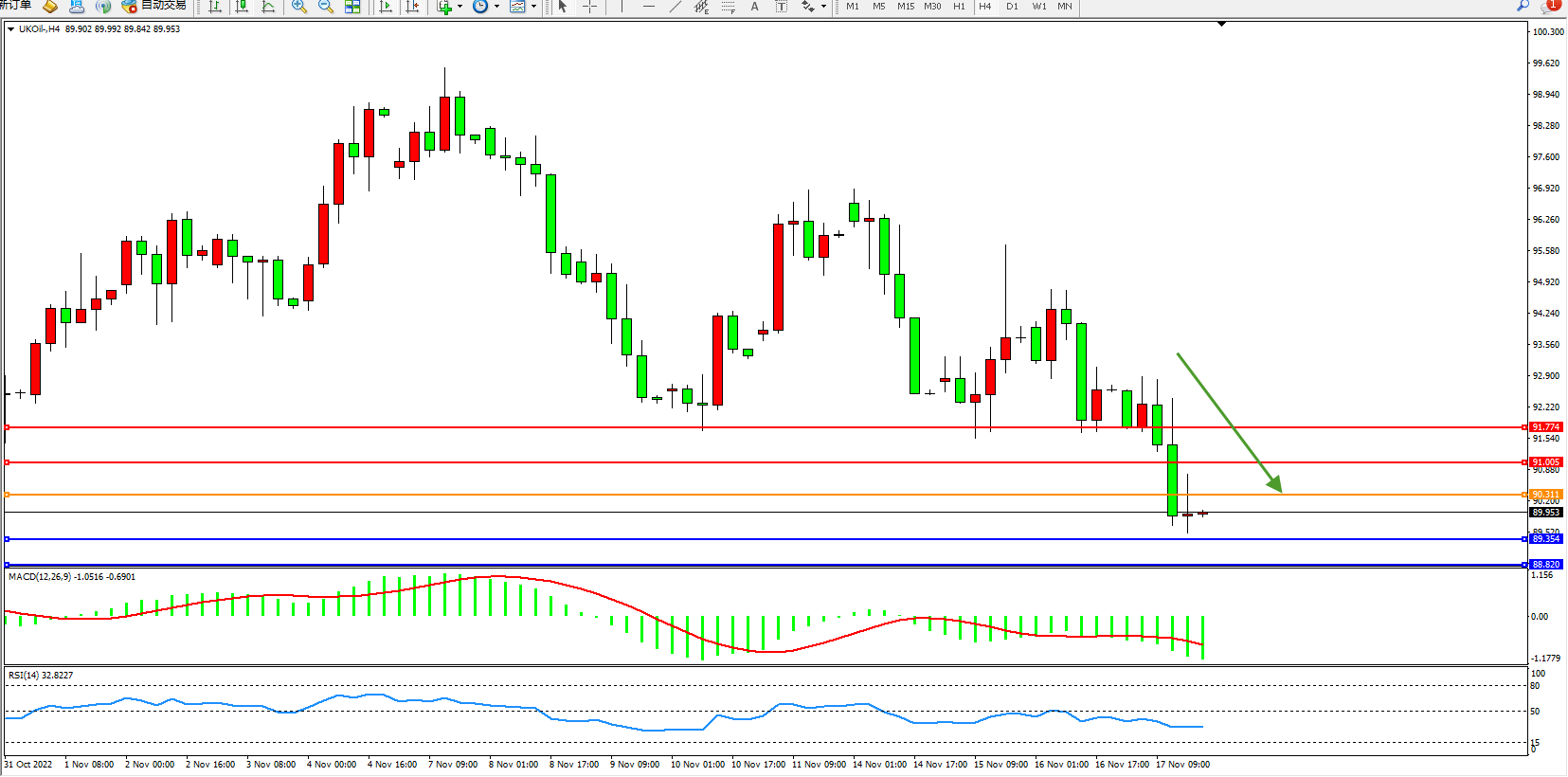 布油维持89.953附近震荡,在北约解除俄罗斯对波兰导弹袭击的嫌疑后,原油价格下跌。看起来俄罗斯没有升级战事,这暂时消除了能源市场一些短期供应风险。