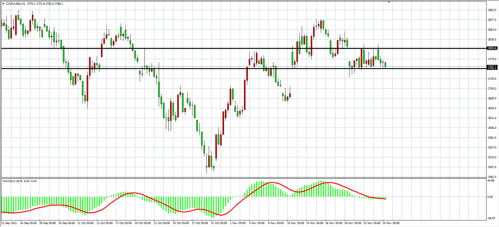 1小时图看,沪深300在回调3755后再度止跌,目前于3755-3800间形成盘整走势,MACD量能柱在零轴附近缩量,若上破3800目标上看3850-3900,跌破3755则下看3700-3600。