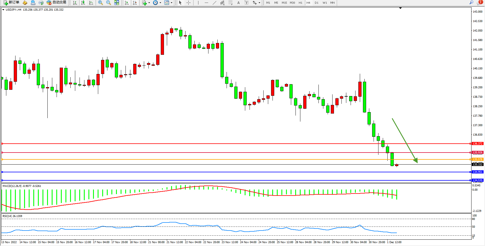 交易策略:135.578下方看跌,目标134.951、134.535