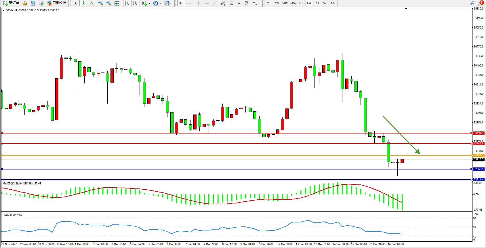 道琼斯指数DJ30——4小时K线图显示: