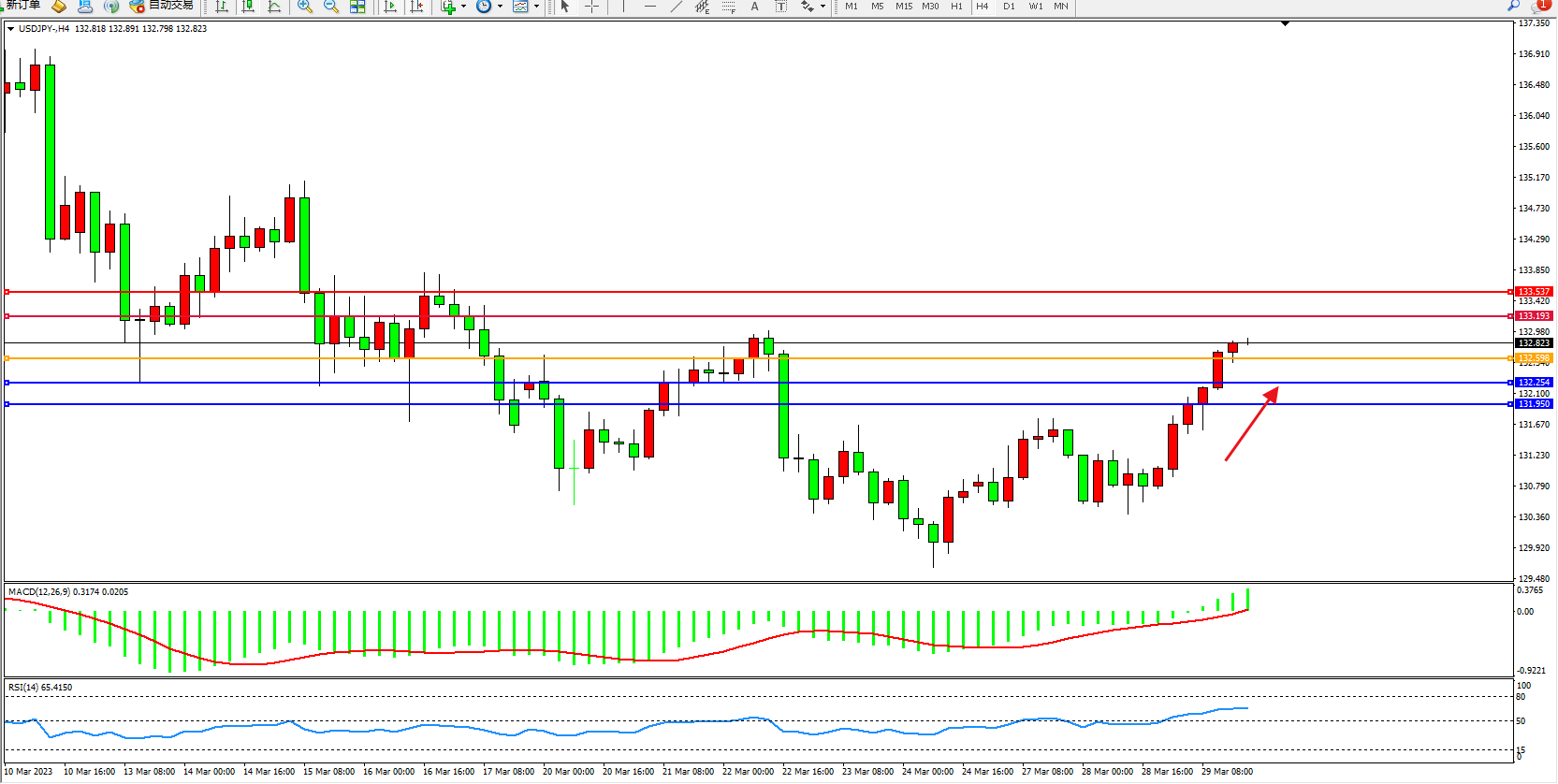 交易策略:132.598上方看涨,目标133.193  133.537