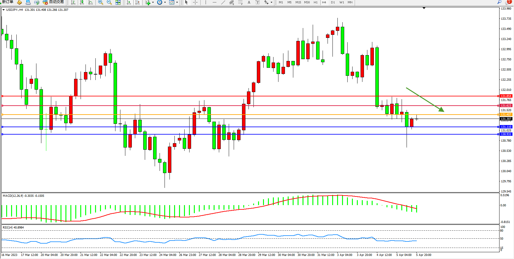 交易策略:131.407下方看跌,目标131.110 130.931