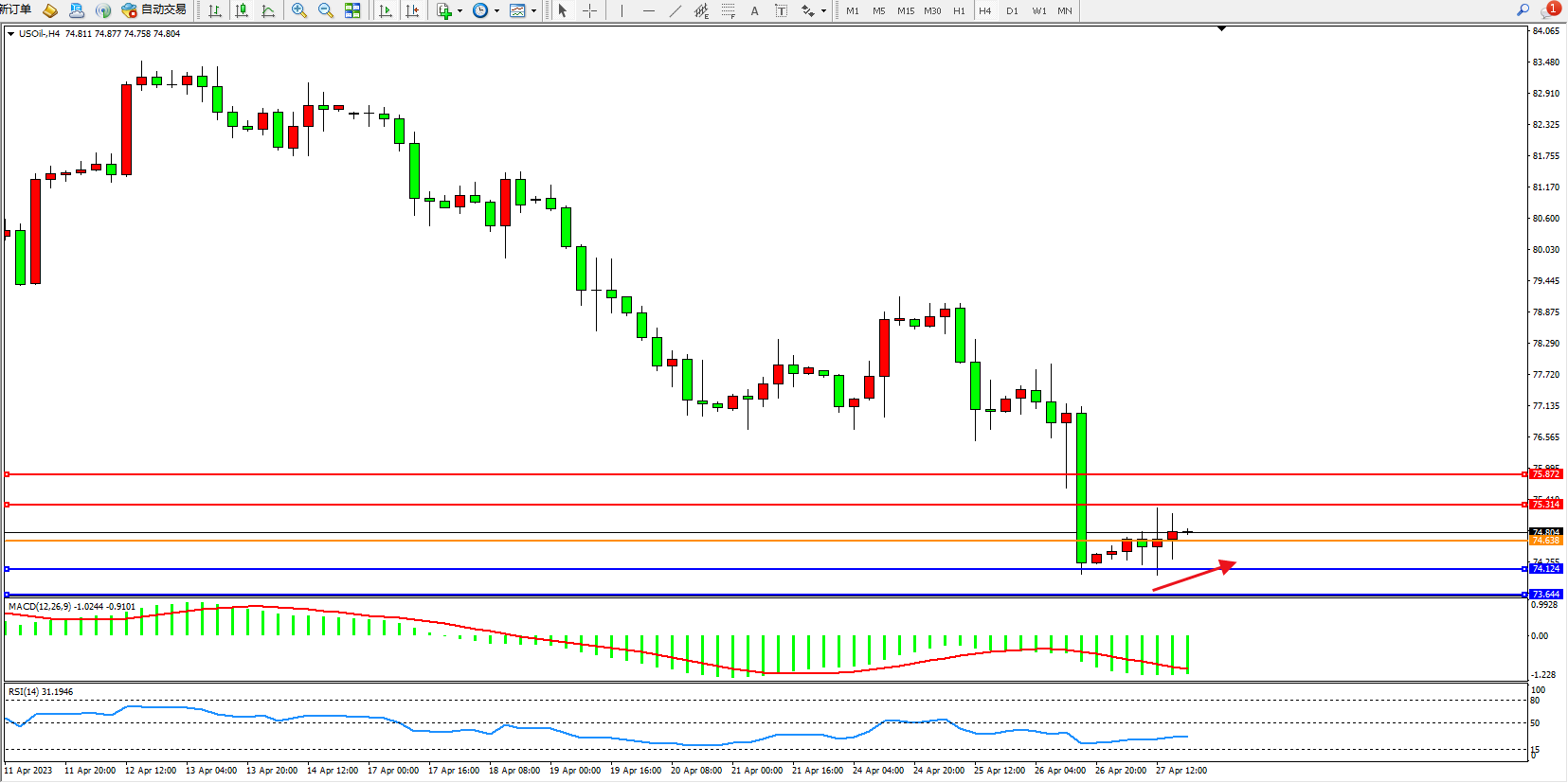 支撑位:74.124 73.644