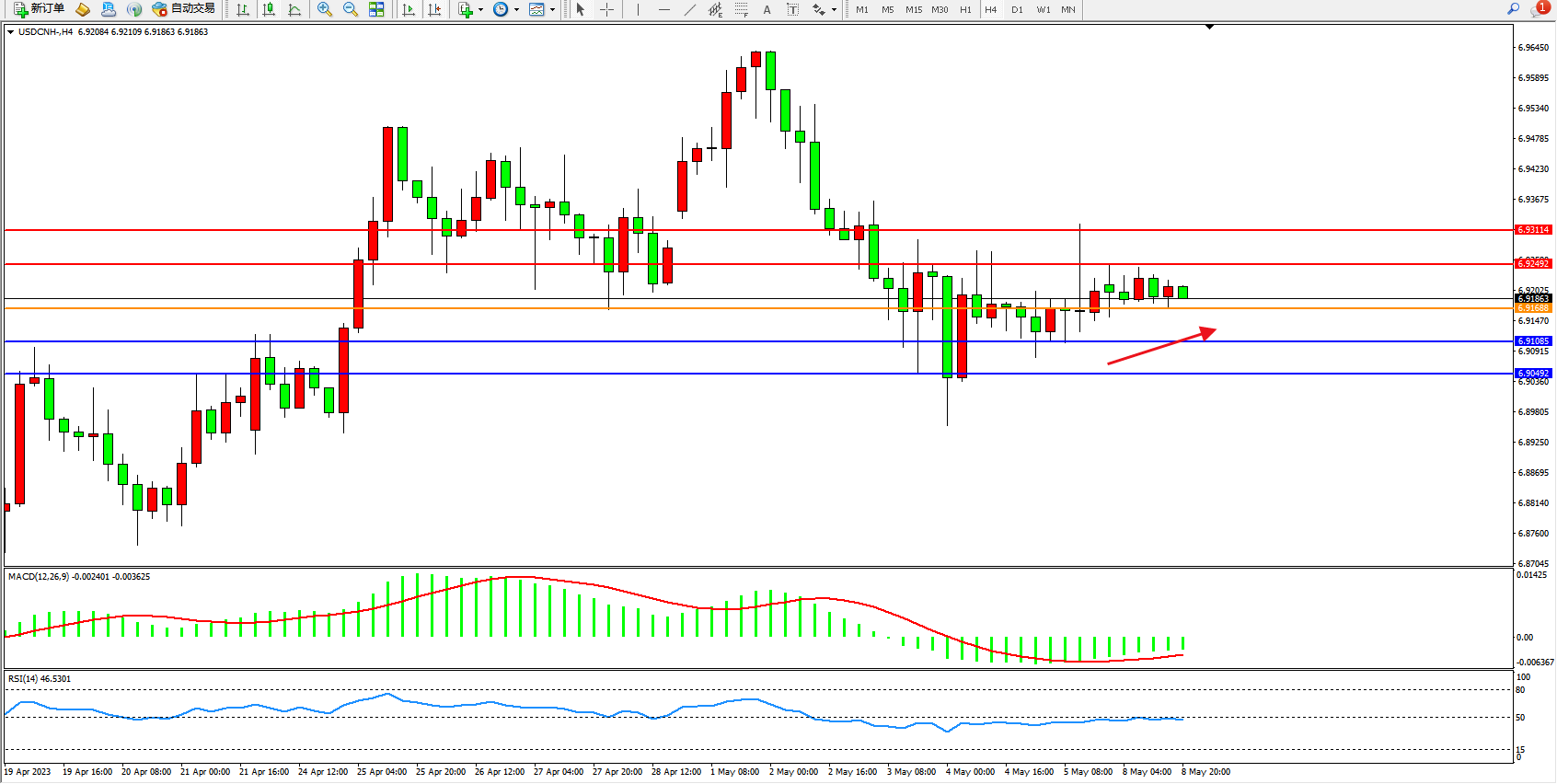 交易策略:6.91688上方看涨,目标6.92492  6.93114