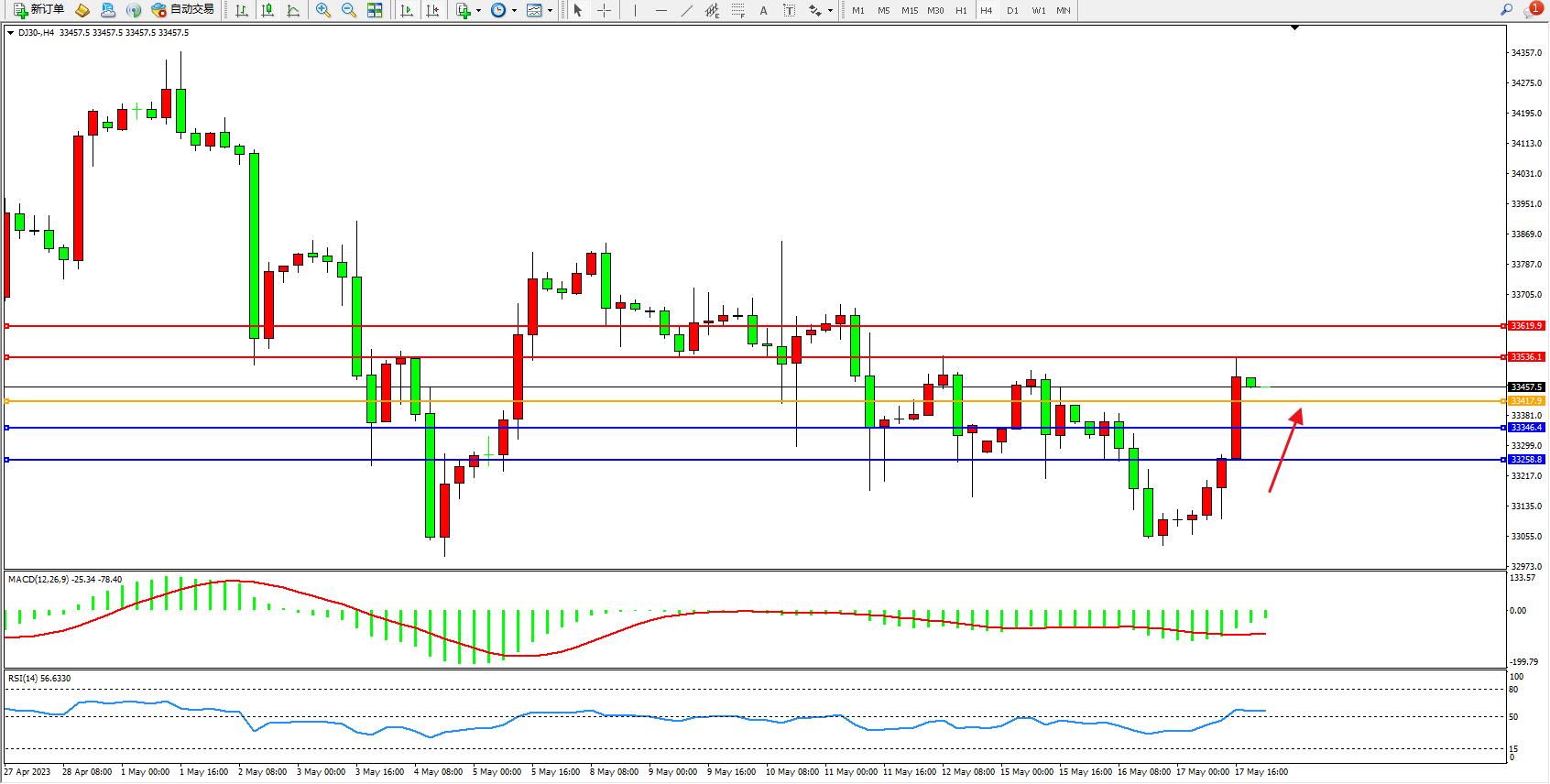 道琼斯指数DJ30——4小时K线图显示: