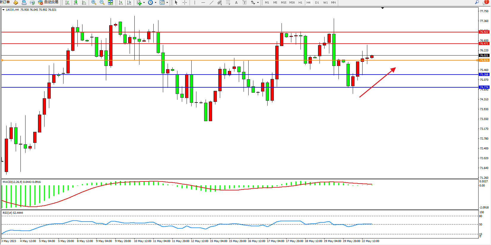 交易策略:75.825上方看涨,目标76.471  76.922