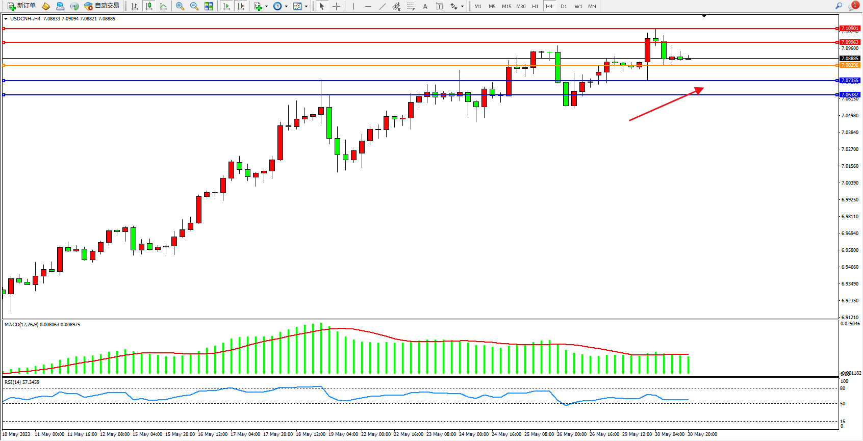 美元人民币USDCNH——4小时K线图显示: