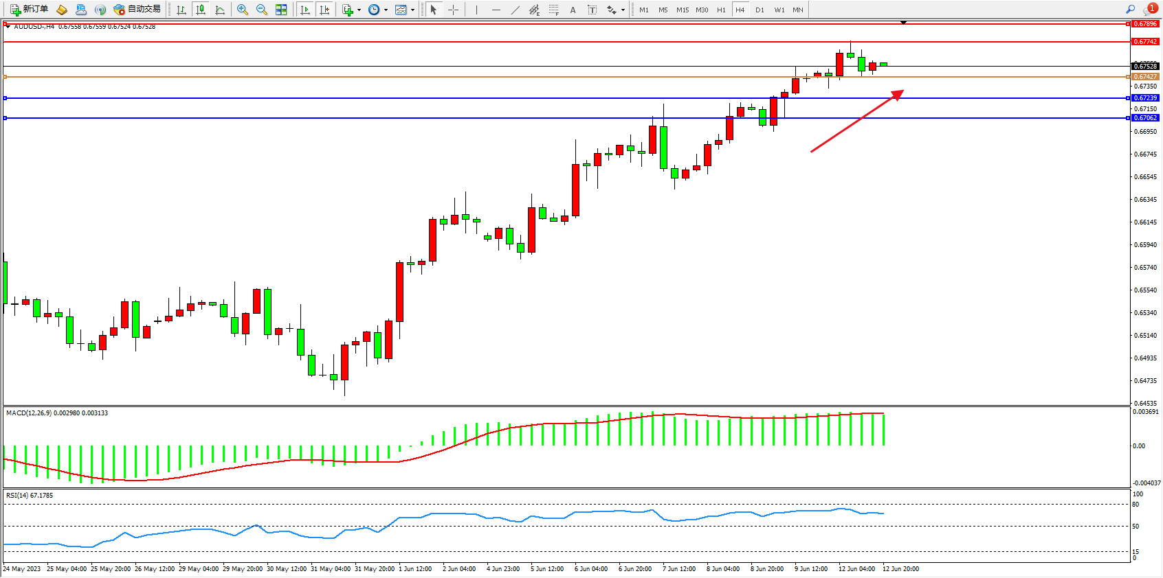 交易策略:0.67427上方看涨,目标0.67742  0.67896