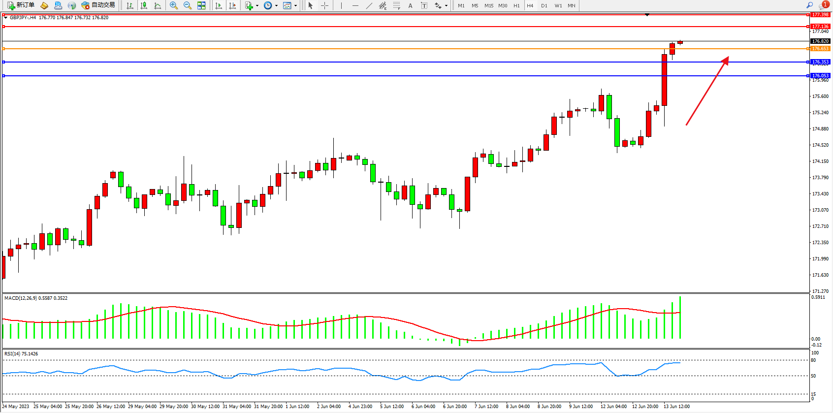 英镑兑日圆维持176.820附近震荡,市场对英国央行的加息押注激增,利率峰值预期上升12个基点至5.7%。