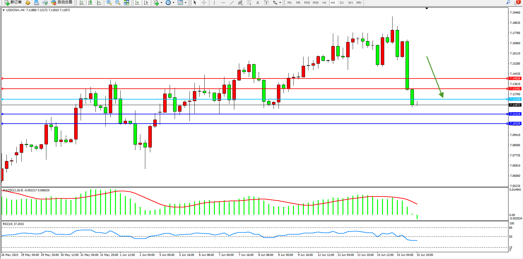 美元人民币USDCNH——4小时K线图显示: