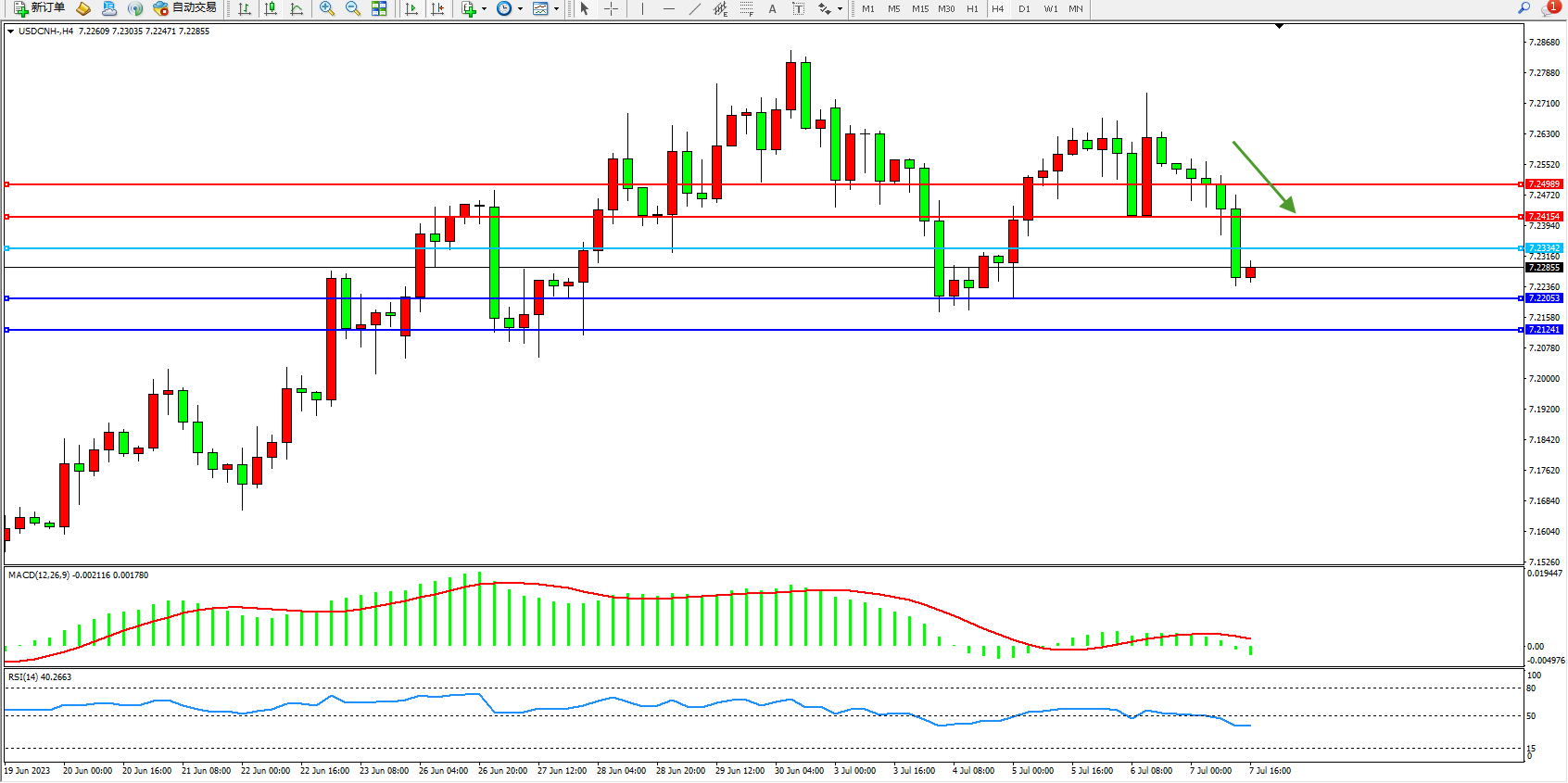 美元人民币USDCNH——4小时K线图显示: