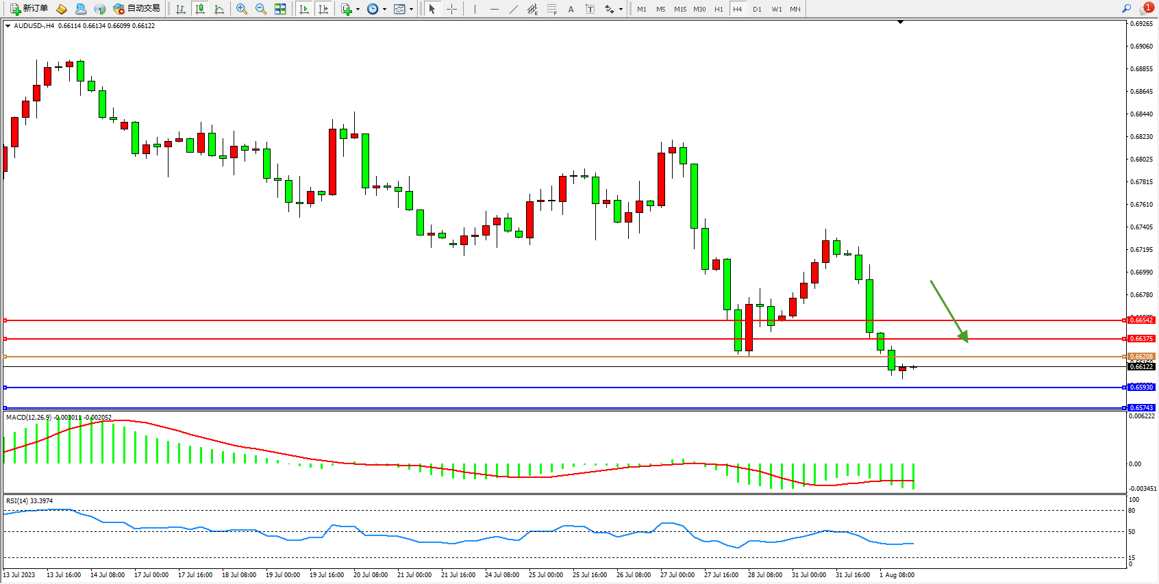 澳元美元AUDUSD——4小时K线图显示:
