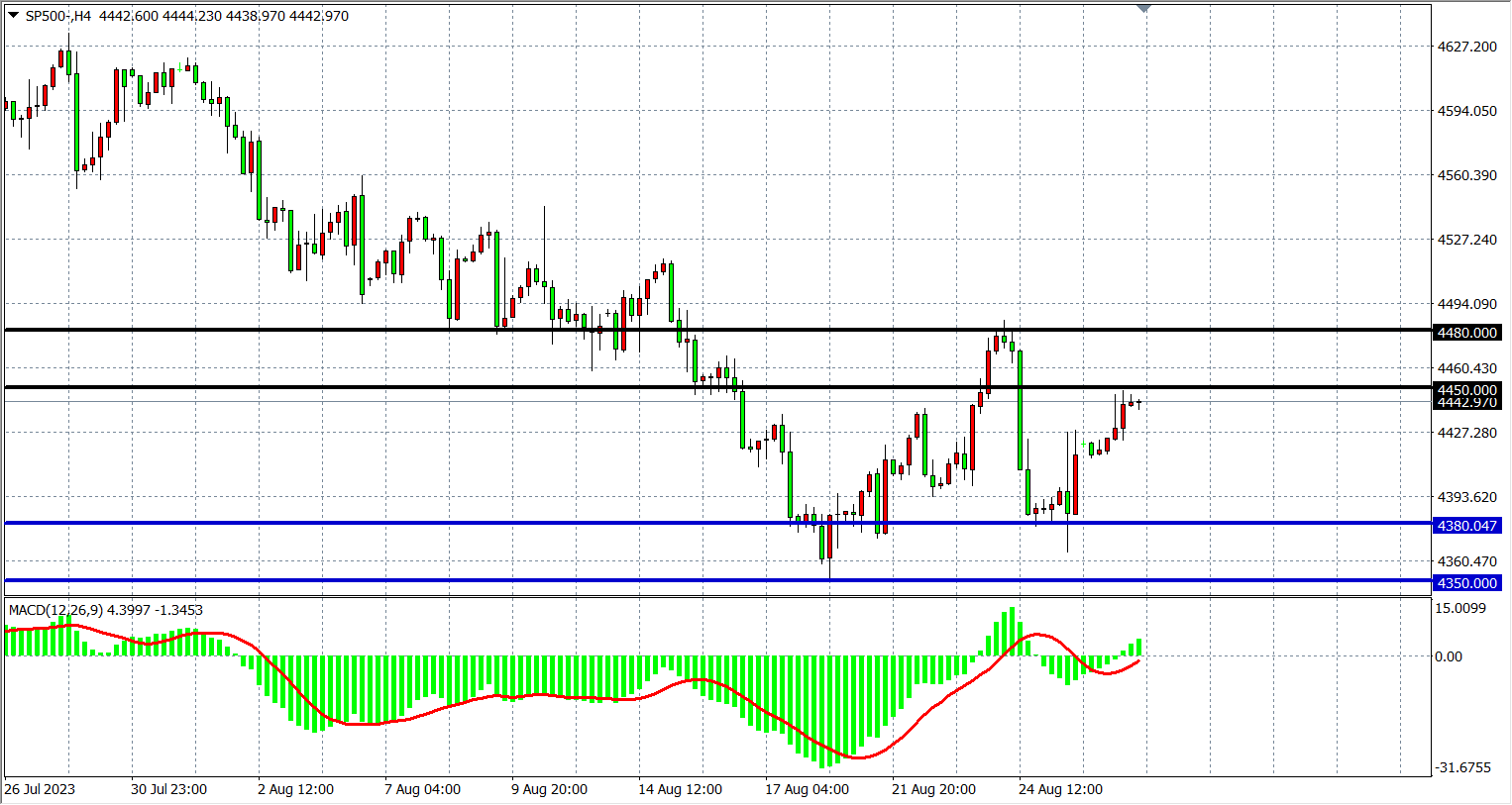 4小时图看,标普反弹4450附近暂时受阻,MACD量能又再上穿零轴,行情走势进入宽幅整理,阻力关注4450-4480附近,下方支撑4380-4350。