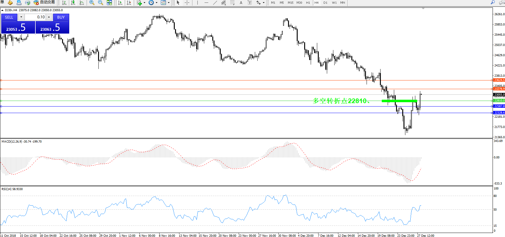 美元指数在不甚积极的市场预期推动下重拾跌势,而美国股市也再现疲态,道指盘中一度重挫600点,虽然尾盘再度大幅反弹,但市场面对消费者信心数据出现巨大滑坡时所透露出的顾虑情绪,连同美国政府开门仍无望的背景,依旧暗示年内剩余时间市场情绪基调仍将艰辛。但在临近尾盘时受到抄底大资金趁着圣诞新年假期交投清淡时分入场的推动,股指再度绝地反击,道指尾盘反而上涨逾200点,这进一步巩固了多头上涨的反转形态。