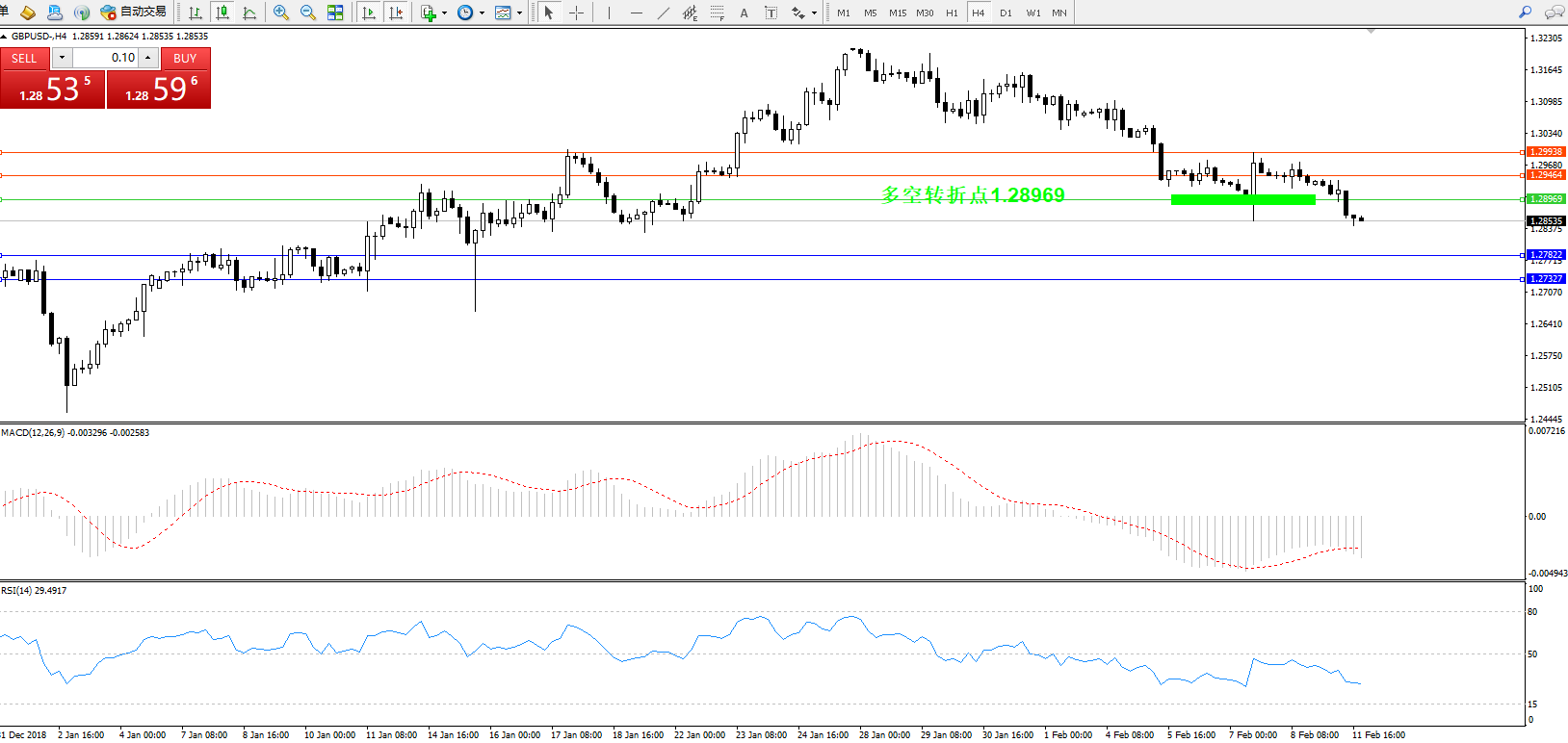交易策略:1.28969下方看跌,目标1.27822、1.27327
