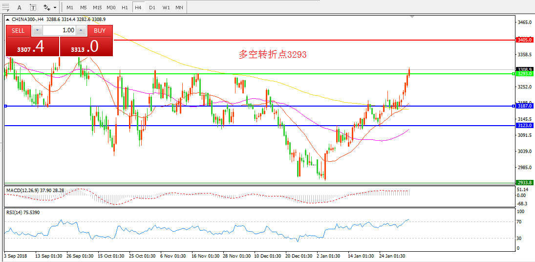 小时图看,CHINA300中华指数均线系统呈多头排列,整体走势十分强势。 MACD红柱增加,RSI拐头向上,维持偏多思路。