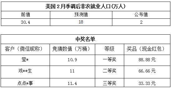 2月份非农就业人数大竞猜”活动中奖结果已出,获奖信息如下: