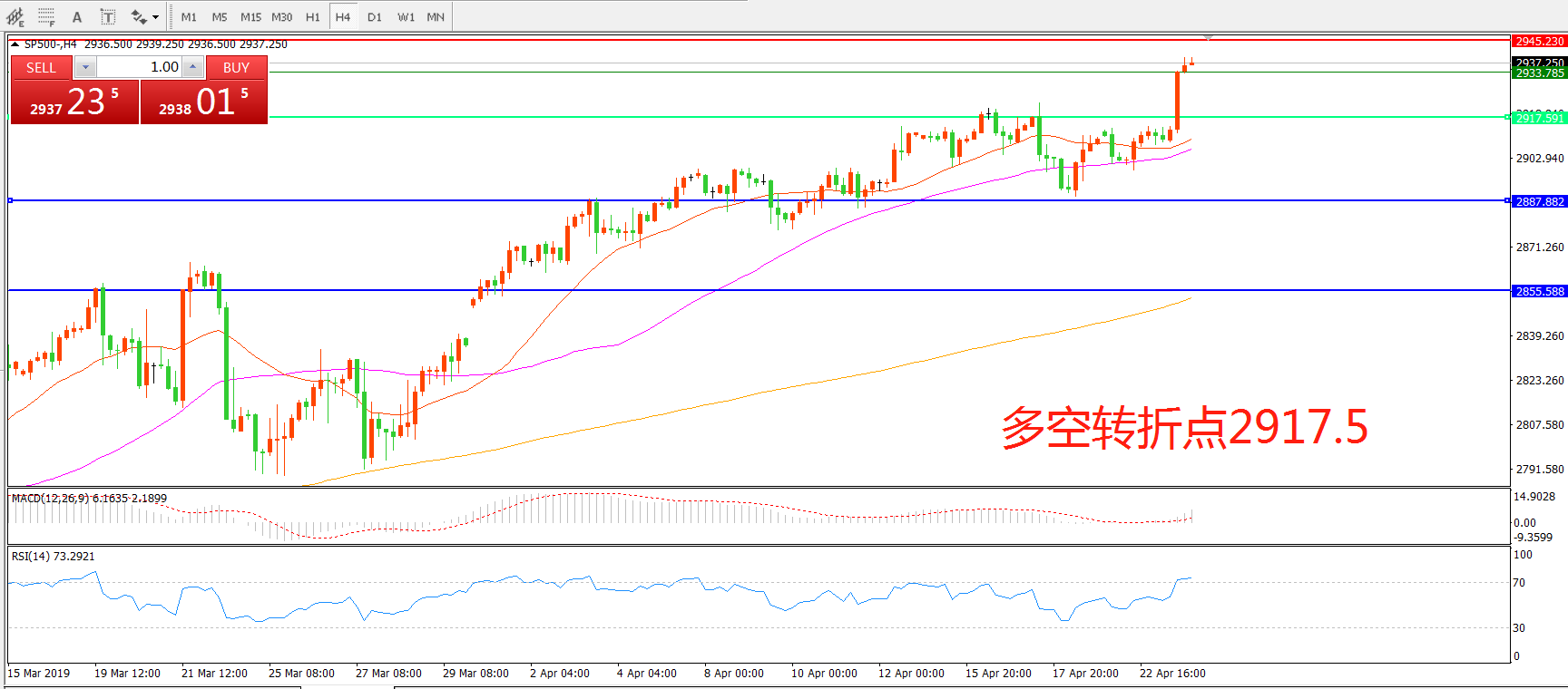 4小时图看,标普500盘整后强势拉升,一举突破前期阻力后,整体走势较强, MACD红柱走平,RSI指标向上,日内预计延续上升概率较大。