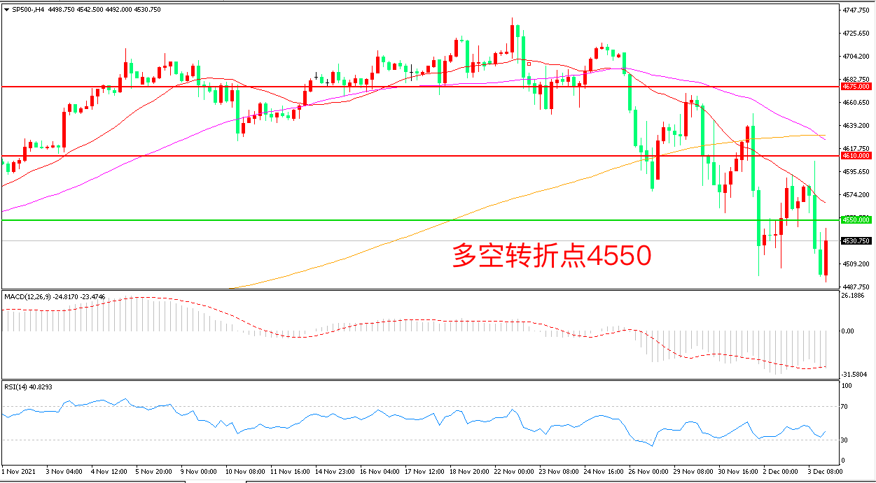 4小时图看,标普500触碰21周期均线后长阴下破,短期走势偏空,4550成为短期阻力,4500成为下方支撑,MACD绿柱增加,RSI指标走平,日内震荡下行概率较大。