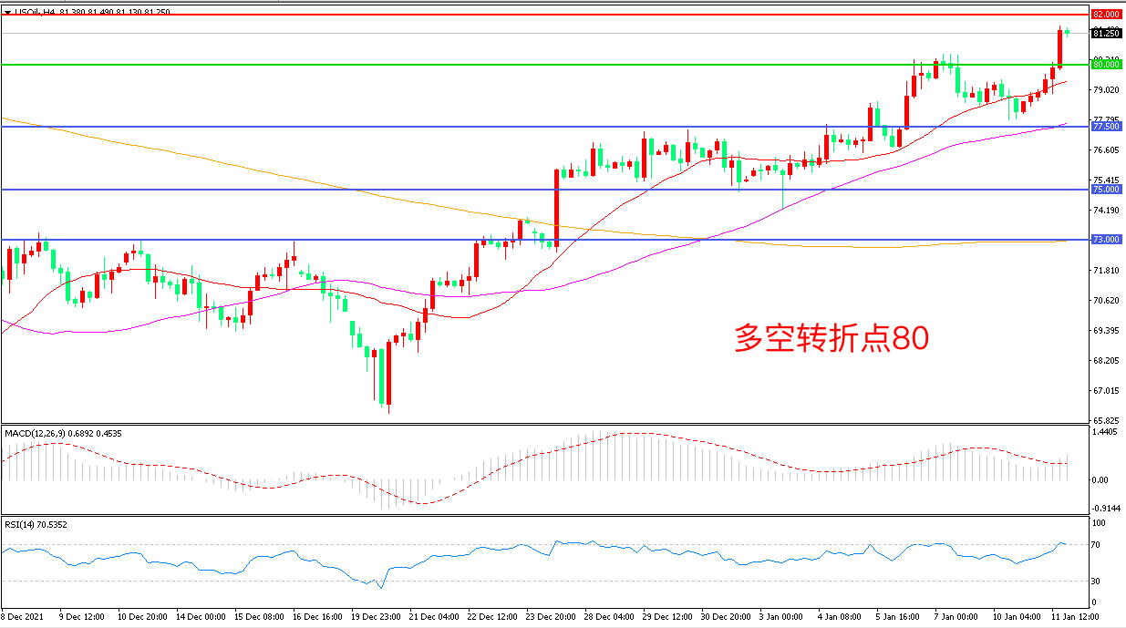 4小时图看,油价长阳拉升,突破前期整理区间,整体表现偏强,80成为多空分水岭,MACD红柱增加,RSI指标走平,日内震荡上行概率较大。