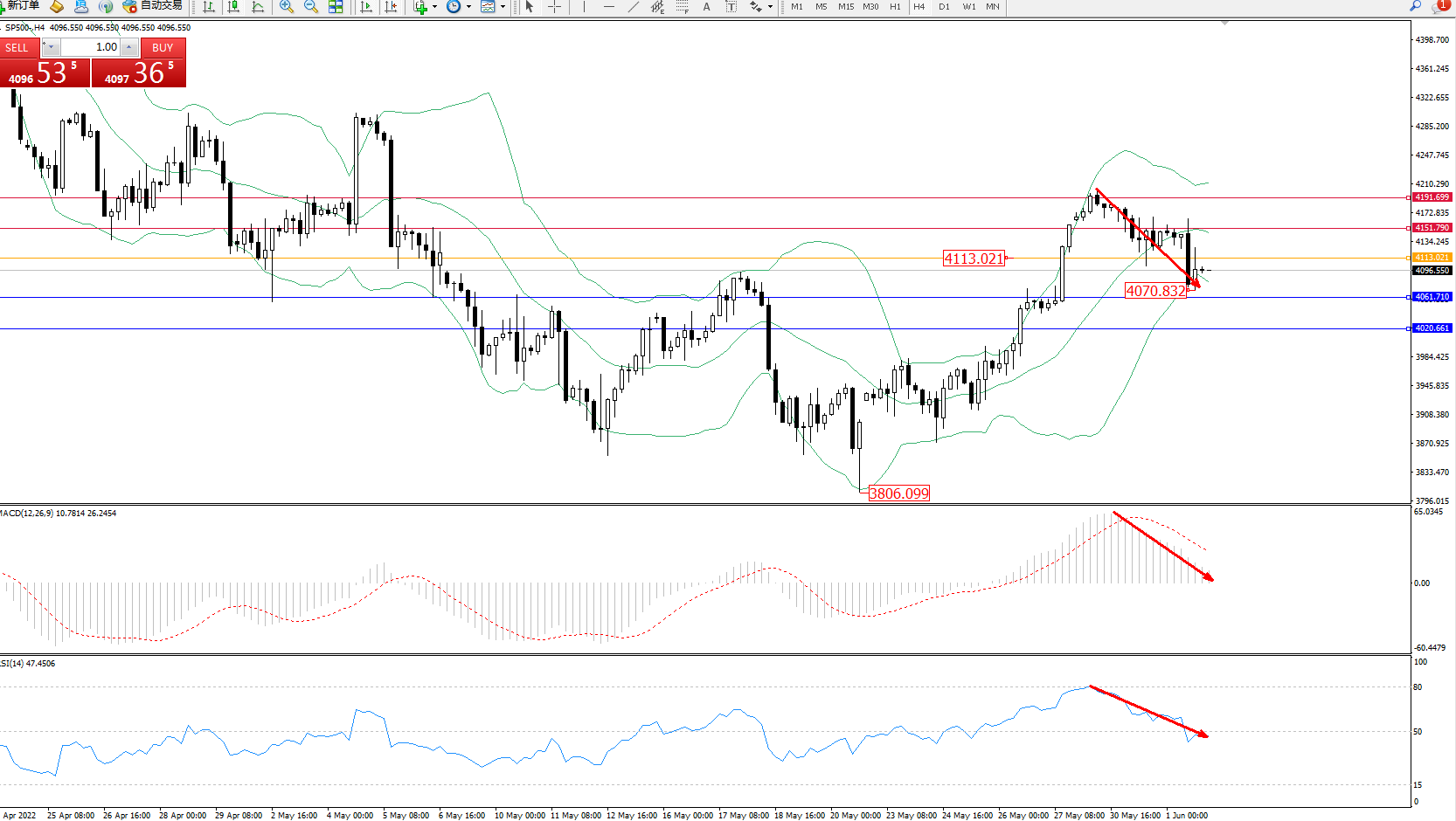 标普SP500——4小时K线图显示: