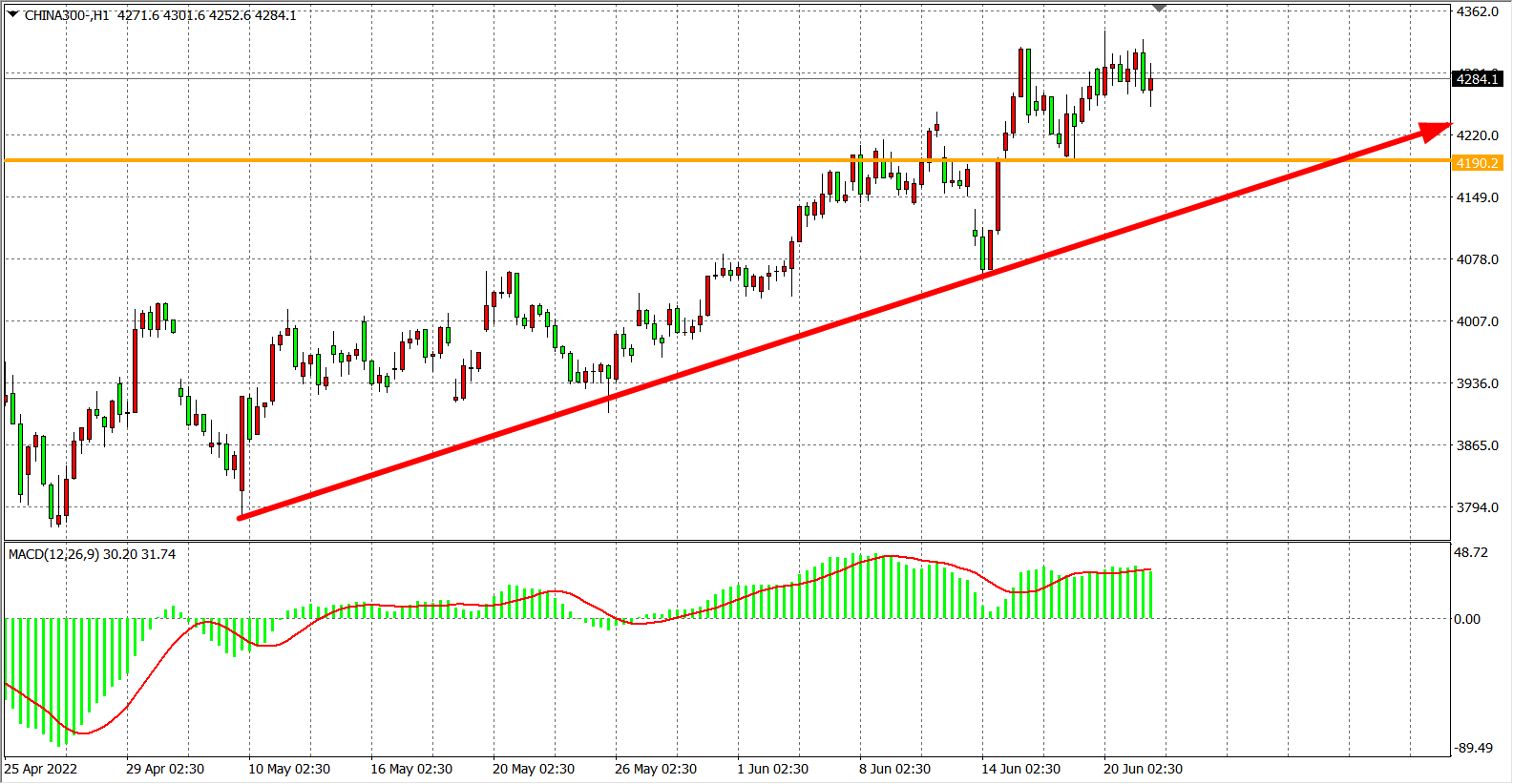 1小时图看,沪深300指数上破4190后,阻力已转化为支撑,当前再度回踩4190企稳延续涨势,MACD在零轴之上开始重新放量,维持在4190之上继续看震荡上涨,目标4320-4450