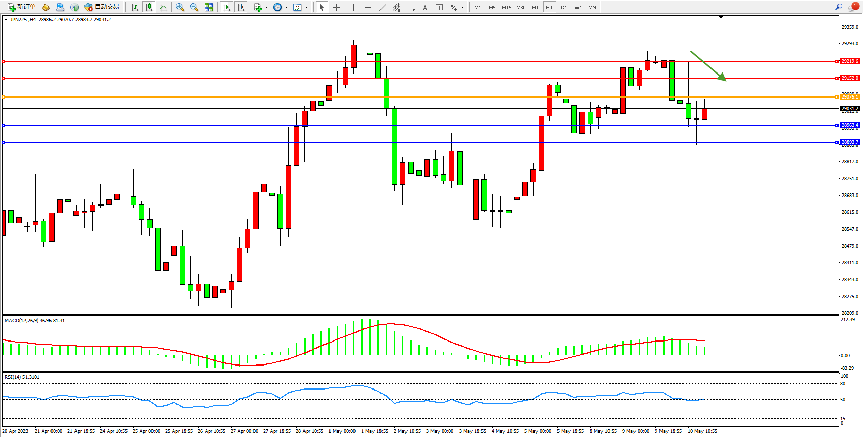 日经225指数5月10日(周三)收盘下跌108.32点,跌幅0.37%,报29134.50点。日本财务省当天发布的统计数据显示,截至2023年3月底,日本中央政府的国债、政府借款、政府短期证券等债务总额达到12704990亿日元,创历史新高。